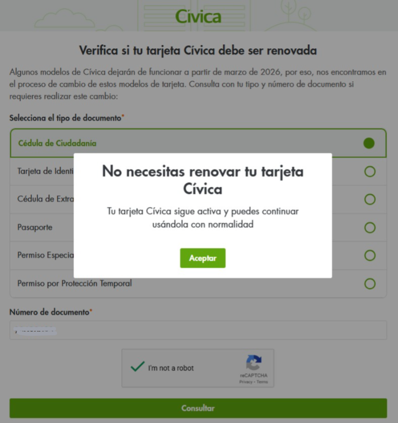 Como novedad, el Metro informó que desde ahora los usuarios pueden verificar en línea si deben renovar su tarjeta. Para ello, pueden ingresar al enlace https://website.civica.com.co/validacion-tarjeta-civica, digitar su número de documento de identidad y consultar si su Cívica requiere el cambio tecnológico.